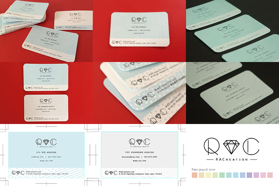 女性を応援する事業も今後手掛けていきたい想いもあり、ファッションブランドのロゴのように、バッグなどの小物や洋服など身につけるものにプリントされてもお洒落に感じてもらえるようなロゴを目指して制作。名刺のカラー展開はフェミニンなペールグレイッシュ。